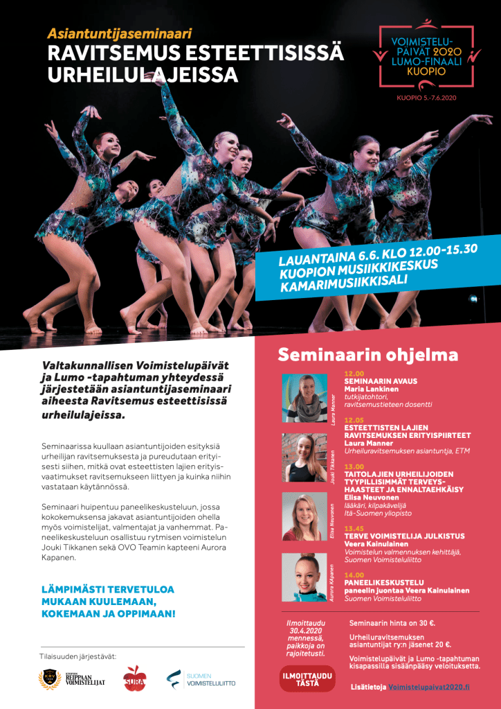 Alta löydät Voimistelupäivien yhteydessä järjestettävän ravitsemusseminaarin ohjelman. SURA:n jäsenet pääsevät tapahtumaan alennettuun 20 euron hintaan. Voit ilmoittautua seminaariin täältä