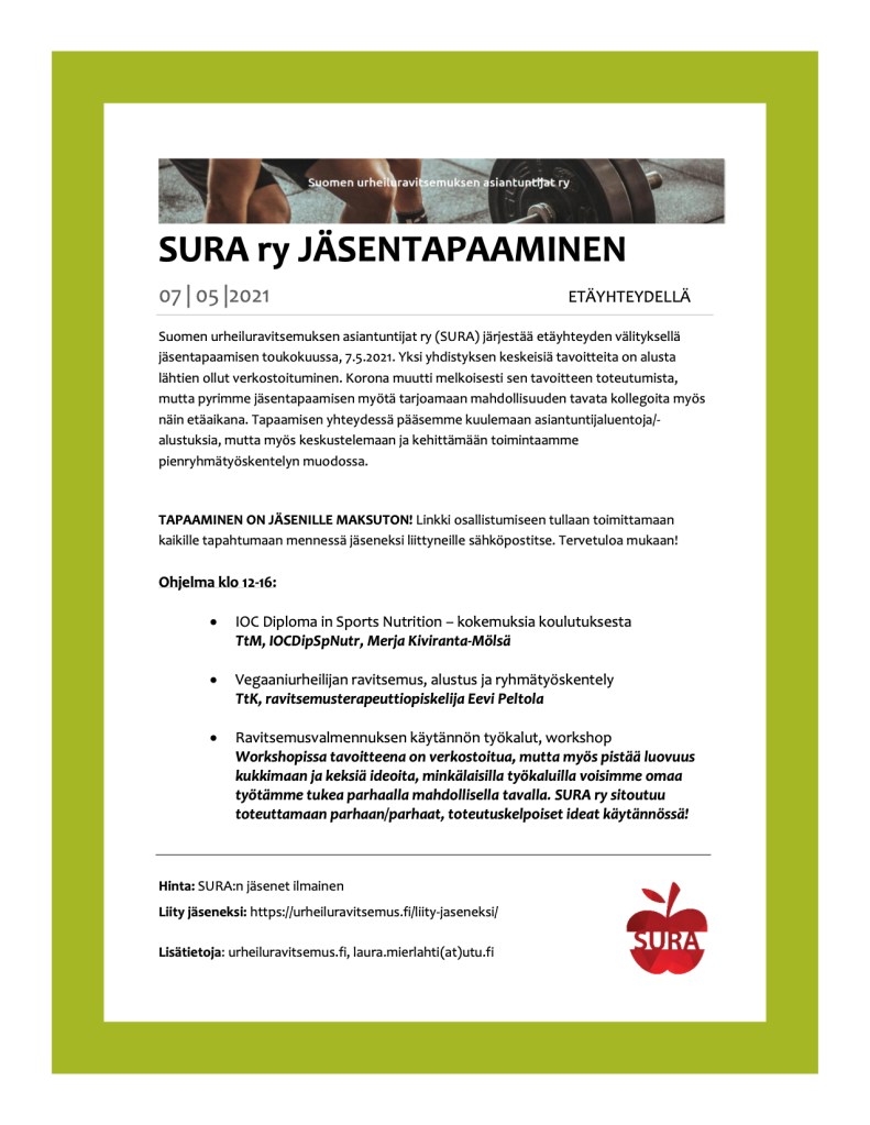 Toukokuussa järjestetään SURA:n jäsentapaaminen. Vielä ei päästä tapaamaan kasvokkain, mutta pyritään silti verkostoitumaan. Tapaaminen on jäsenille maksuton. Katso alustukset ja keskusteluaiheet alla ![]()